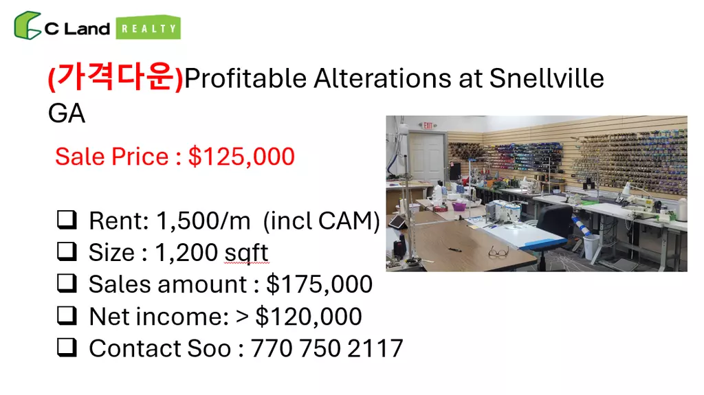 17749 | [ 커머셜 ](가격다운) 옷수선 가게 매매 , 스넬빌 조지아 | 12 | sook | 10/22/2025 |