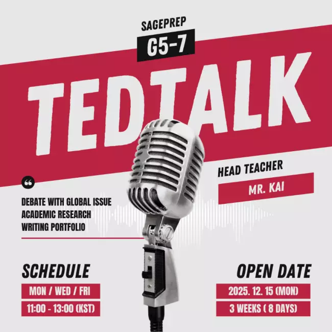 | 18873 | ☀️[세이지프렙 겨울방학 특강 안내] Junior TEDTalk - Social Issue (G5-7) | 12 | 세이지프렙 | 12/09/2025 |