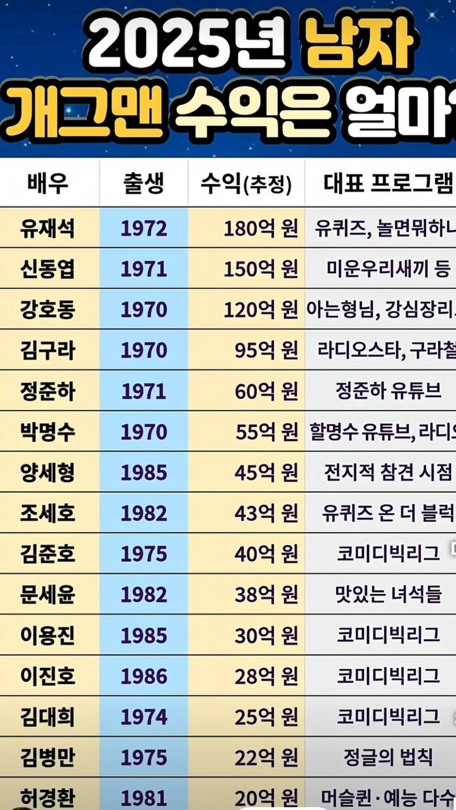 | 18908 | 한국 개그맨들 수입 어마어마하네요. | 18 | sunrise life | 12/11/2025 |