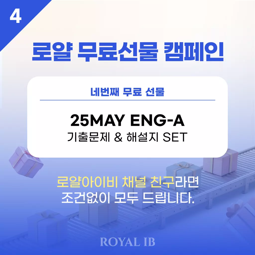 | 20646 | [무료선물 캠페인] 4탄 - 오직 채널 친구만! IB 1타 강사진이 준비한 ENG A 최신 기출문제&해설지 세트 | 8 | 로얄아이비 | 02/05/2026 |