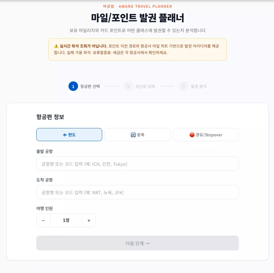 이번에 저희 웹사이트에 마일/포인트 항공권 발권 플래너 배타버전을 출시했습니다.