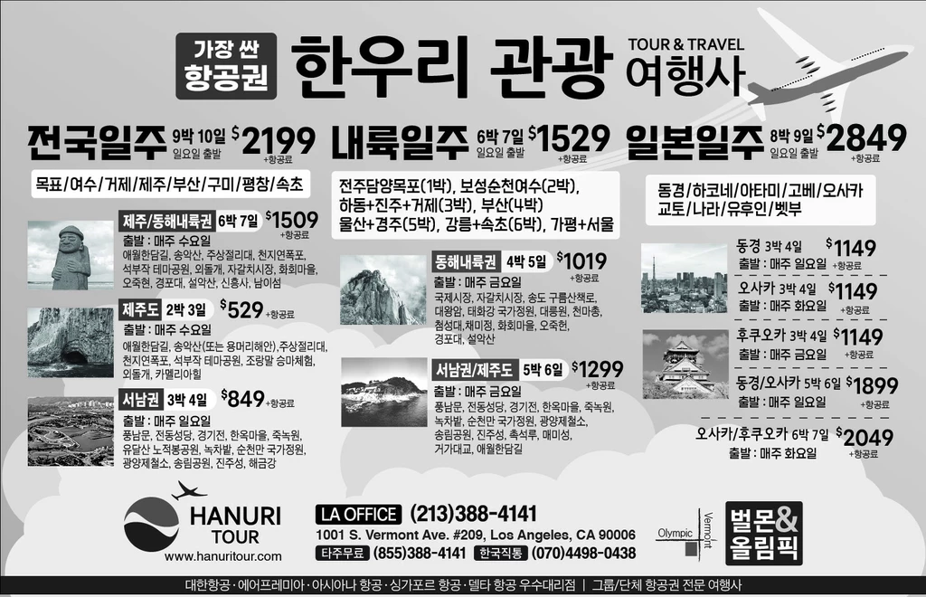 ★ 미국 전지역,북미, 중남미, 유럽, 동남/북아시아, 선교방문,고국 방문,신혼 여행,가족 여행,크르즈 관광,단체 관광, 등등 모든 항공권및 관광 패키지 상품 취급 합니다.