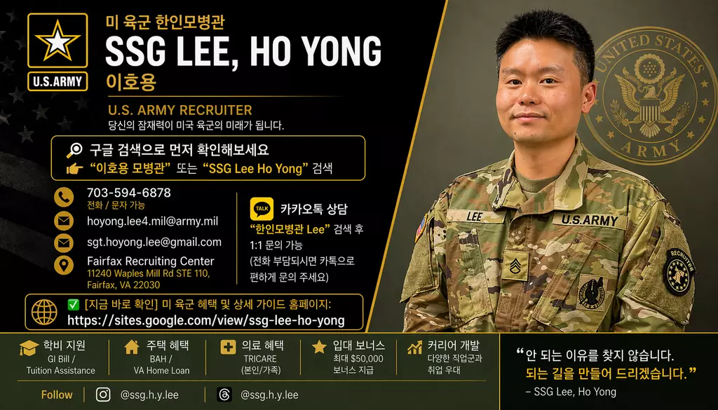 SSG Lee Ho Yong (이호용 모병관)이 미군 입대 조건과 절차를 실제 기준으로 안내드립니다.