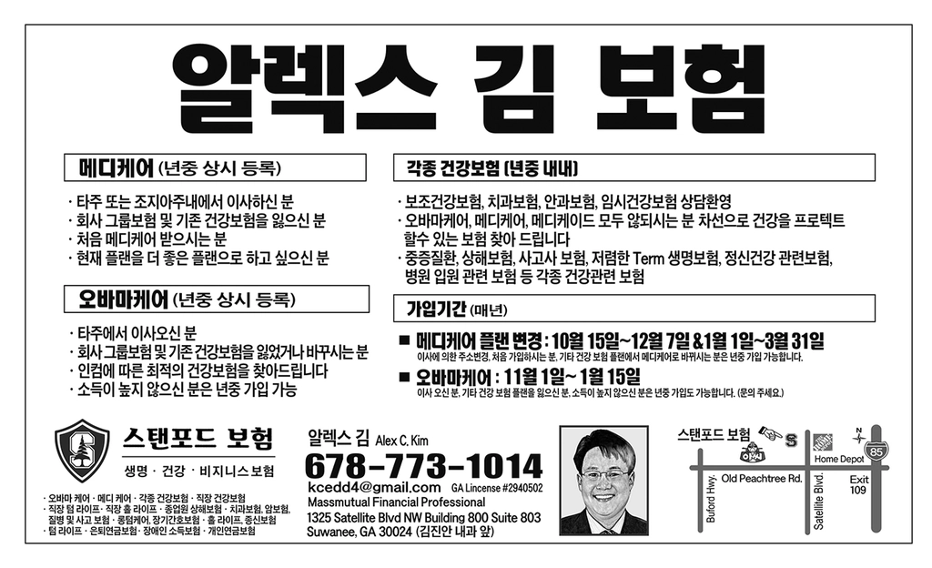오바마케어 메디케어 건강보험 신분이 있는 모든사람은 오바마케어 가입 가능합니다 특히 비싼 직장보험이나 그룹, 단체보험을 가지고 계신분은 저렴한 오바마케어로 변경 가능합니다 이사를 했거나 건강보험을 잃었거나 가족 구성원이 변경되었거나 소득이 아주 높지 않으신분은 년중 아무때나 가입도 가능합니다 오바마케어를 힘들게 정부 사이트에서 직접 하실려고 할 필요가 없으십니다 연락주시면 FREE로 등록하여 드립니다 메디케어 신규등록 및 플랜변경 연락주세요 오바마케어, 메디케어 전문 알렉스 김 보험 678-773-1014 404-424-3124 kcedd4@gmail.com Licensed Agent. 오바마케어, 메디케어, 건강보험, 생명보험 전문