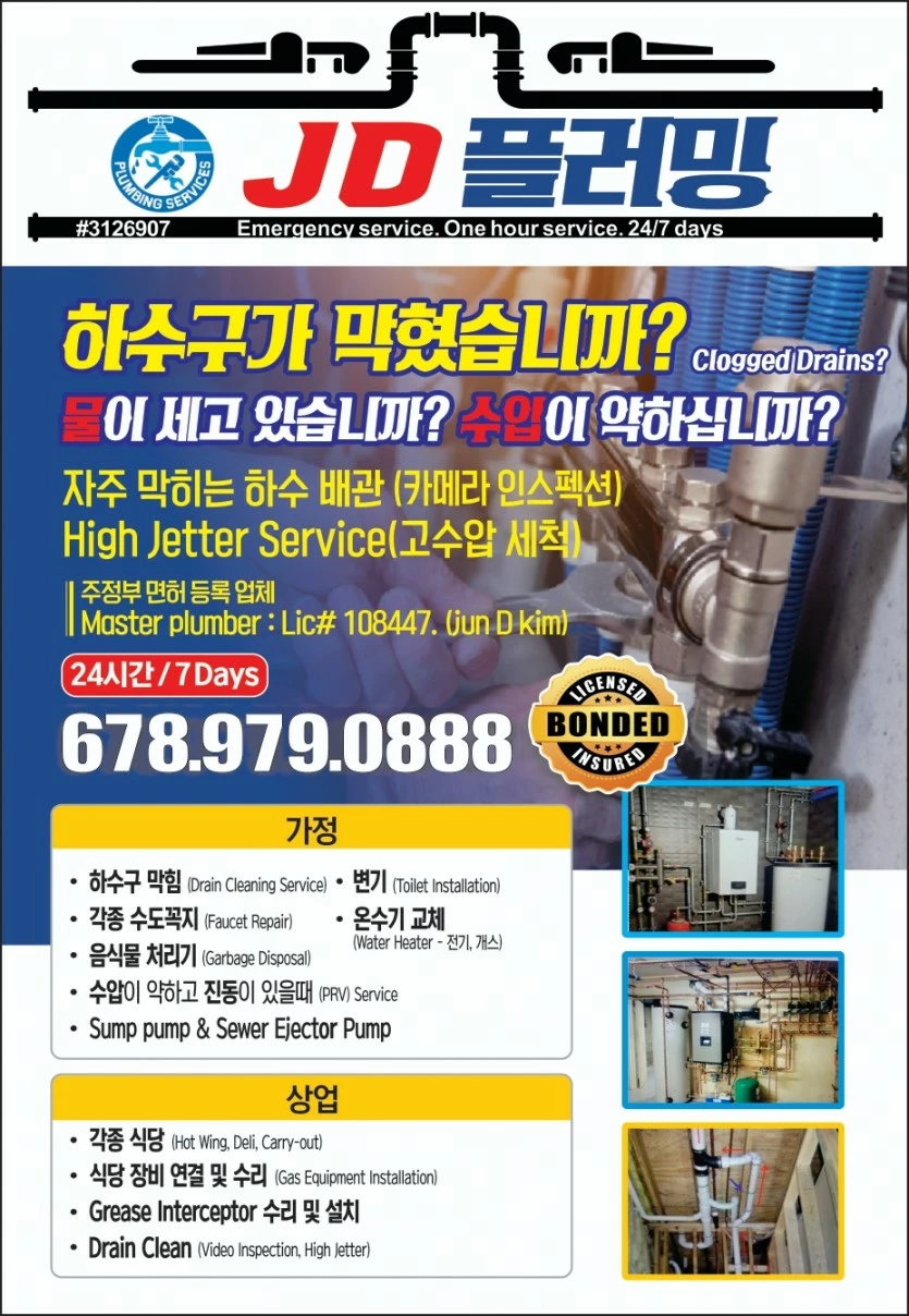안녕하세요!JD PLUMBING SERVICES 입니다!주정부 배관 면허소유및 등록된 플러밍 전문업체입니다 (REGISTERED STATE PLUMBER Lic # MP 108447)