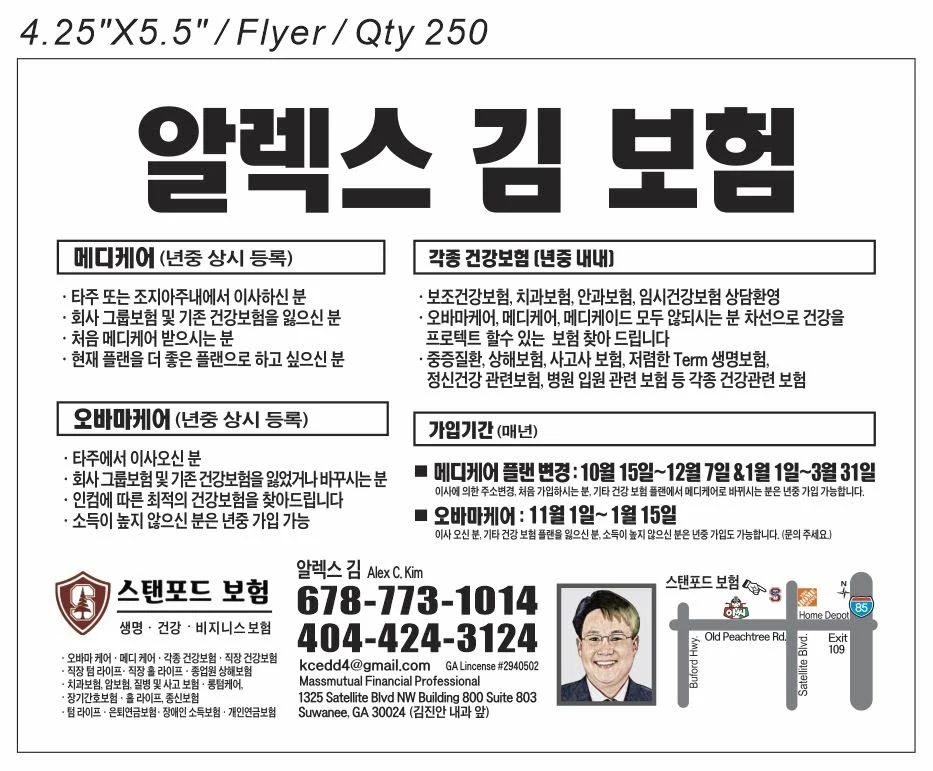 오바마케어 메디케어 각종건강보험 신분이 있는 모든사람은 오바마케어 가입 가능합니다 특히 비싼 직장보험이나 그룹, 단체보험을 가지고 계신분은 저렴한 오바마케어로 변경 가능합니다 이사를 했거나 건강보험을 잃었거나 가족 구성원이 변경되었거나 소득이 아주 높지 않으신분은 년중 아무때나 가입도 가능합니다 오바마케어를 힘들게 정부 사이트에서 직접 하실려고 할 필요가 없으십니다 연락주시면 FREE로 등록하여 드립니다 메디케어 신규등록 및 플랜변경 연락주세요 각종건강보험 : 보조건강보험, 치과보험, 안과보험, 임시 건강보험 등 보험이 없어서 걱정이신분 차선으로 건강을 프로텍트할 보험을 찾아드립니다 중증질환, 상해보험, 사고사보험, TERM 보험, 입원보험, 정신거강보험 등 오바마케어, 메디케어, 건강보험전문 알렉스 김 보험 678-773-1014 404-424-3124 kcedd4@gmail.com Licensed Agent. 오바마케어, 메디케어, 건강보험, 생명보험 전문