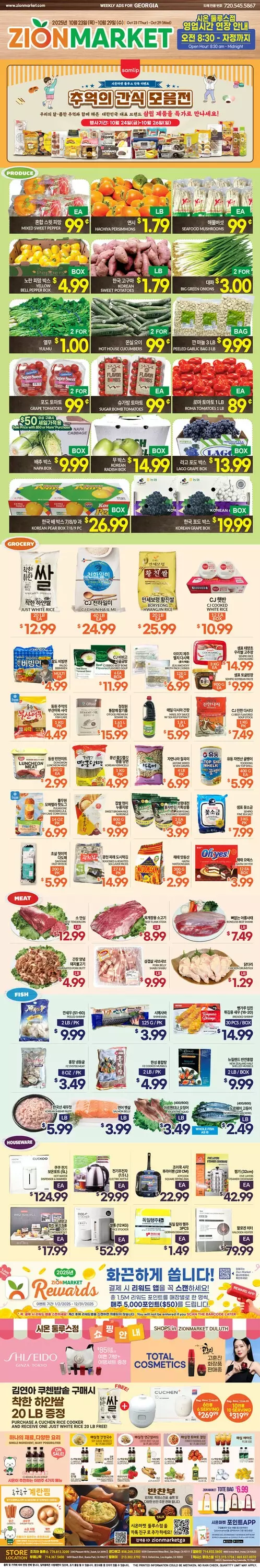 그로서리 코너에서는 착한 하얀쌀 20 LBS 12.99, 만세 보령 황진쌀20 LBS 25.99, CJ 천하일미40 LBS 24.99, 유동 자연산 골뱅이400 G 5.99, CJ 비비고 사골곰탕6 EA BOX 11.99, 샘표 태양초 우리쌀 고추장3 KG 14.99,샘표 토굴된장900G 9.99, 해태 맛동산300 G 2.99, 풍년 쫄깃쫄깃 명품 당면 1 KG 4.99, 샘표 꽃소금3 KG 7.99, 자연나라 칠곡미4 LB 6.99, CJ 햇반 12 EA BOX 10.99,매일 다시마 간장1.8 L 5.99, 동원 추억의 부산어묵 사각1 KG 4.49, 풀무원 모짜렐라 핫도그 14 OZ 6.99,팔도 비빔면MULTI 4.99에 공급된다.