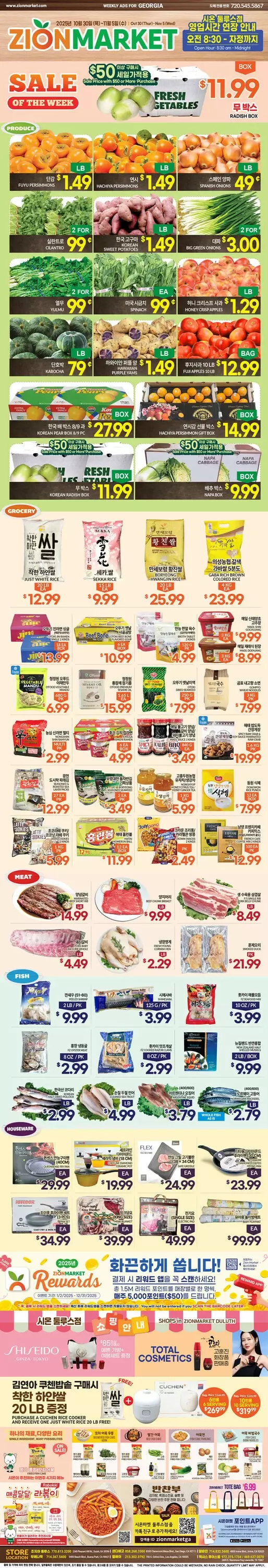 그로서리 코너에서는 착한 하얀쌀 20 LBS 12.99, 만세보령 황진쌀20 LBS 25.99, 세카 쌀15 LBS 9.99, 청정원 통참깨 참기름1.65 L 15.99, 농심 신라면 멀티MULTI 2.99, 크라운 조리퐁198 G 2.49, 오뚜기 진라면 순한맛 싱글 18 EA BOX 13.99, 해태 홈런볼 12 EA BOX 11.99, 남양 프렌치카페 커피믹스 마일드100 EA PK 12.99, 종가 김치 컵라면 6 EA BOX 4.99, 만능 한알 육수 깊은120 G 4.99, 광천 파래 도시락김27 EA PK 12.99,해태 밥도둑 간장게장1.6 KG19.99, 보령대천 돌자반김 기획상품2 EA PK 3.49, 의성농협 갈색 가바쌀 5분도4 KG 23.99 , 오뚜기 옛날미역250 G 7.99에 판매된다.