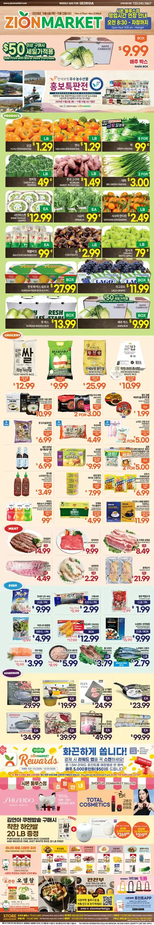 그로서리 코너에서는 착한 하얀쌀 20 LBS 12.99, 만세보령 황진쌀20 LBS 25.99, CJ 반반미15 LBS 9.99, 착한 하얀 즉석밥12 EA BOX 10.99, 청정원 사골 곰탕6 EA BOX 10.99, 하림 미식 매운라면MULTI 2/3.00, 팔도 일품 짜장면 볼190G 1.99, 왕 도미살로만든 어묵2.2LB 6.99, 노티드 바닐라 크림 도넛3.5 3OZ 2/5.00, 오리온 카스타드30 EA BOX 9.99,곰표 대파크림치즈 팝콘125G 2/5.00, 이디야 스페셜 골드블랜드 리치크래마 커피믹스100 EA BOX 11.99 에 선보인다.