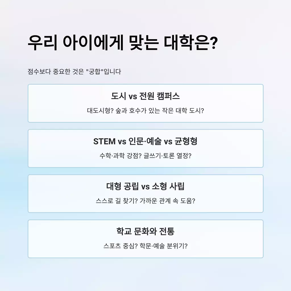 우리 아이에게 가장 잘 맞는 대학을 찾기 위한 간단한 설문지를 준비했습니다.