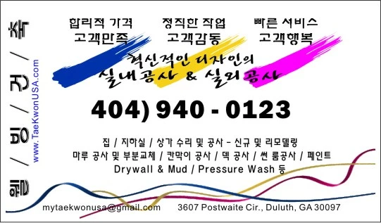 실내 인테리어 공사 (칸막이-Drywall, 벽 웨인스코팅-Wall Wainscoting등) 및실외 익스테리어 공사(드라이브 웨이,덱 공사, 펜스 공사, 콘크리트 작업 등)Phone: 404) 940 - 0123전화를 못 받았을 경우에는 메세지를 부탁드립니다.감사합니다 !!!