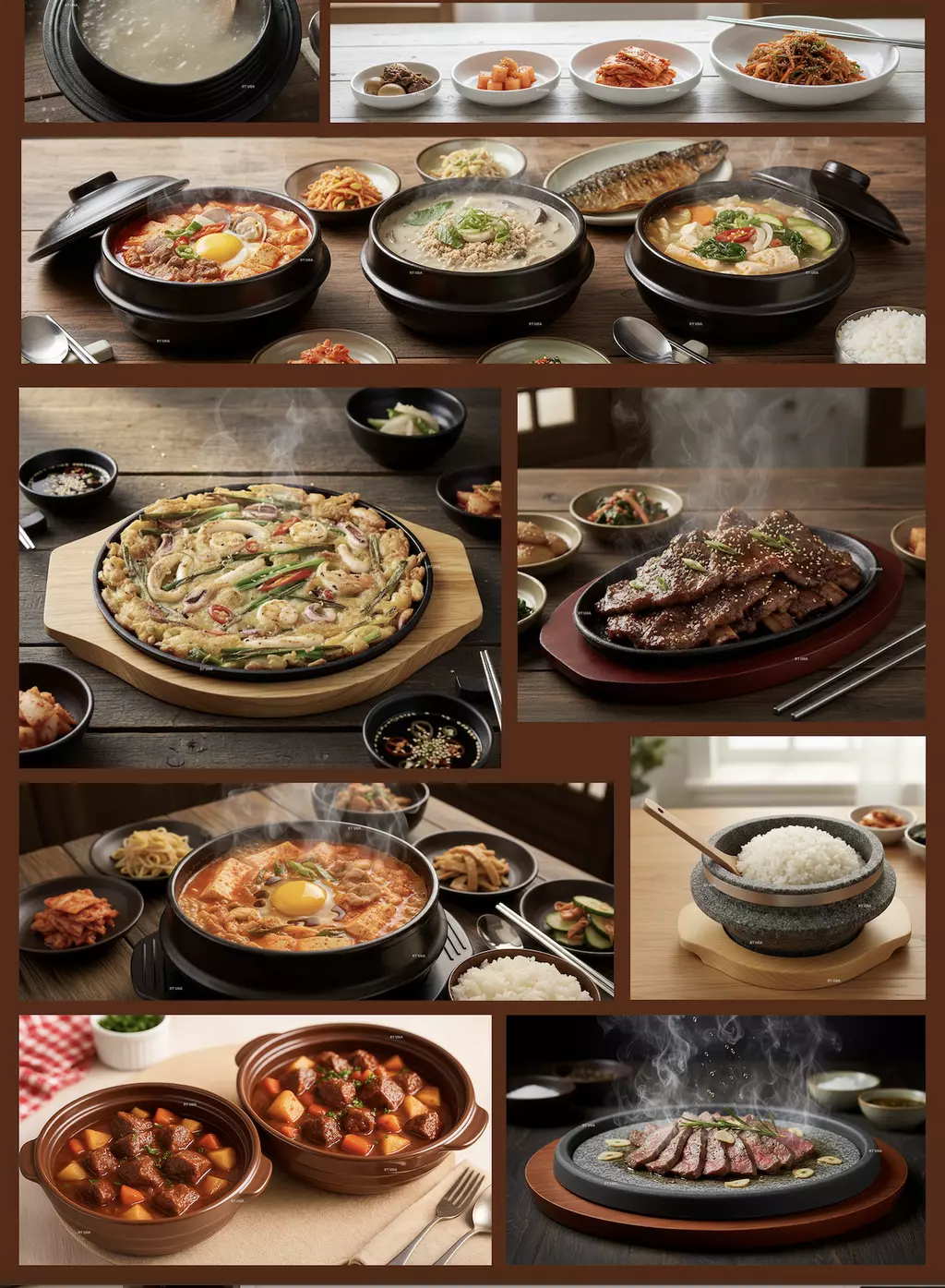 Korean ceramic stone pots, dolsot (stone rice bowls), ceramic rice bowls, hot pot dishes, griddle pans, heat-resistant bowls, side dish bowls, ladles, and chopsticks - complete wholesale dinnerware and kitchen equipment for Korean restaurants.