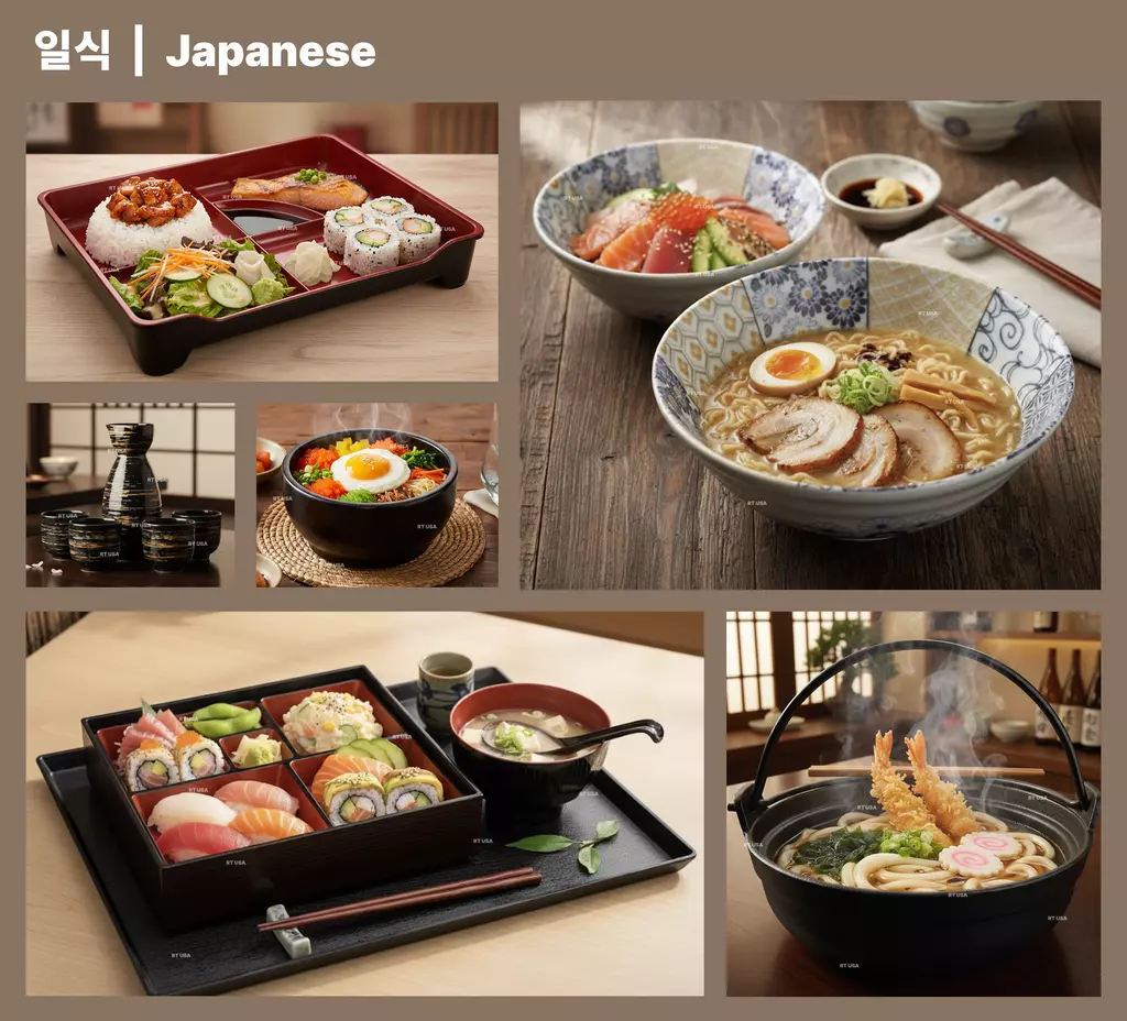 일식: 쟁반, 미소볼, 일식 국물 스푼, 면기, 우동기 등 신선한 회와 스시를 돋보이게 하는 정사각 회접시, 원형 접시, 대형 플래터, 등등.