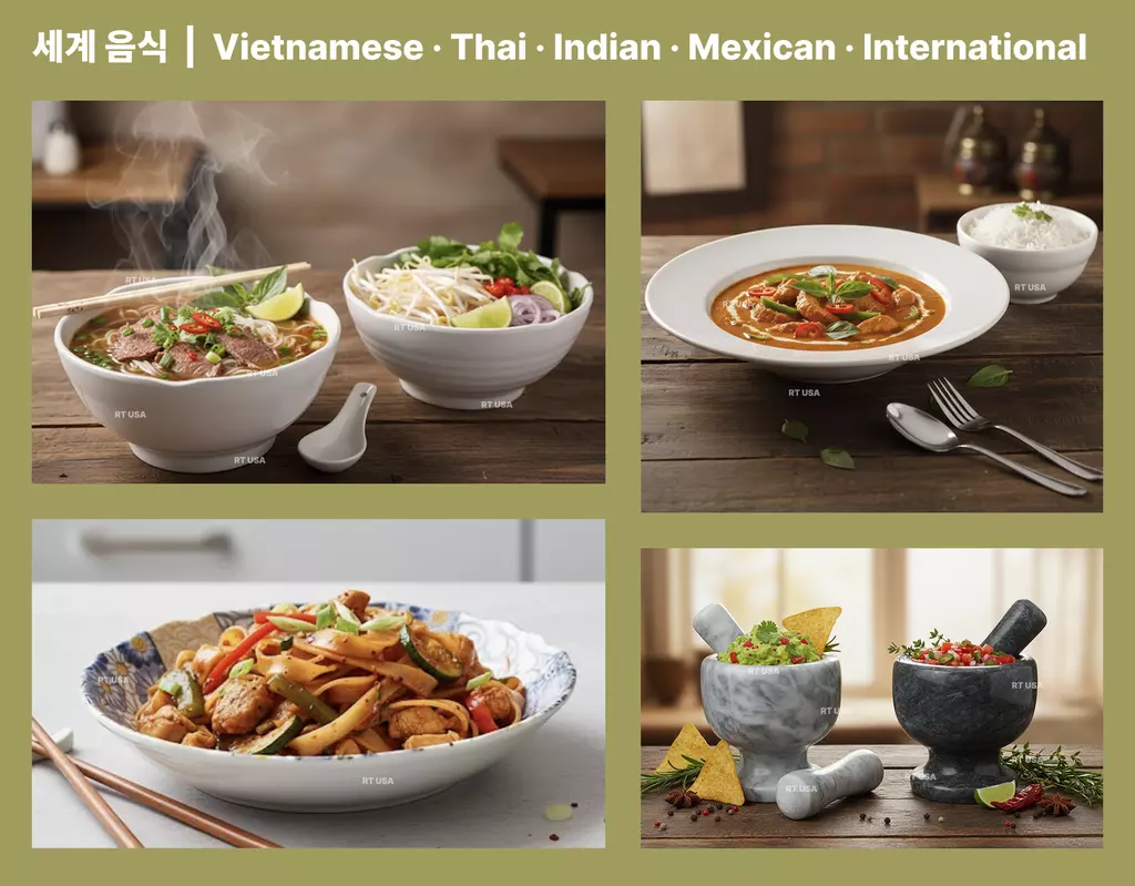 세계음식: 대형 면기, 국물볼, 스텐 국자, 큰 스탁팟. 신선한 채소, 고기, 국물을 예쁘게 담을 수 있는 다양한 사이즈 접시와 찬기, 멜라민 쟁반과 대형 플래터, 카레볼. 대형 웍팬으로 타이 볶음요리를.