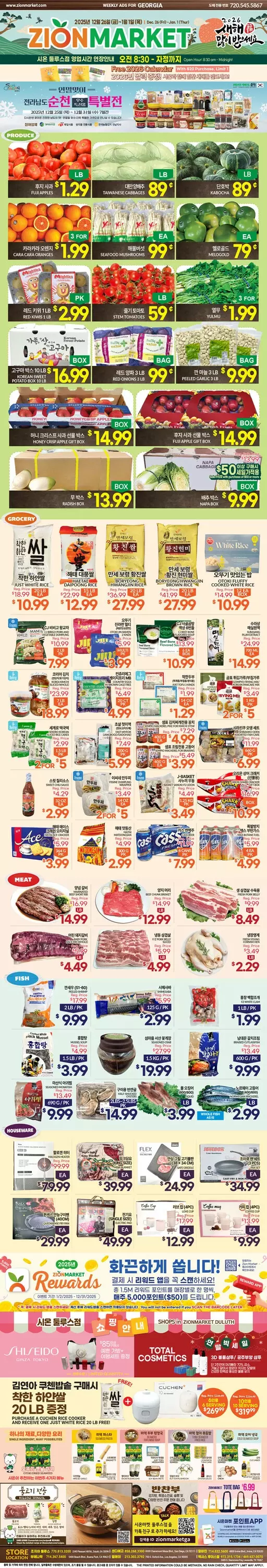 그로서리 코너에서는 착한 하얀쌀 20LB 10.99, 해태대풍쌀 15LB 12.99, 만세보령 황진 현미쌀 20LB 27.99, 만세보령 황진쌀 20LB 27.99, 오뚜기 맛있는 밥 12EA BOX 10.99, 코리아 김치 18.99, CJ 사골곰탕 액상 6번들 10.99, 오뚜기 진라면 3.99, 수라상 매실원액 14.99, 곰표 튀김가루/부침가루 2FOR 5.00, 착한 두부 1.29, 세계로 떡국떡 2FOR 5.00, 컨추리에그 케이지프리 MB 4.99, 초살 첫미역 5.99, 샘표 김치찌게전용 꽁치 3.99~4.99, 이씨네 만두피 2FOR 5.00, CJ 비비고 왕교자 7.99, 사누끼 우동 3.49, 시라카두 오뎅세트 6.99, 스윗 칠리소스 2.99, 해태 에이스 크래커 오리지널 3.99, 해태 맛동산 2.99, 오리온 상어 크래커(선물용) 10.99, 카스 캔 맥주 7.99에 판매된다.