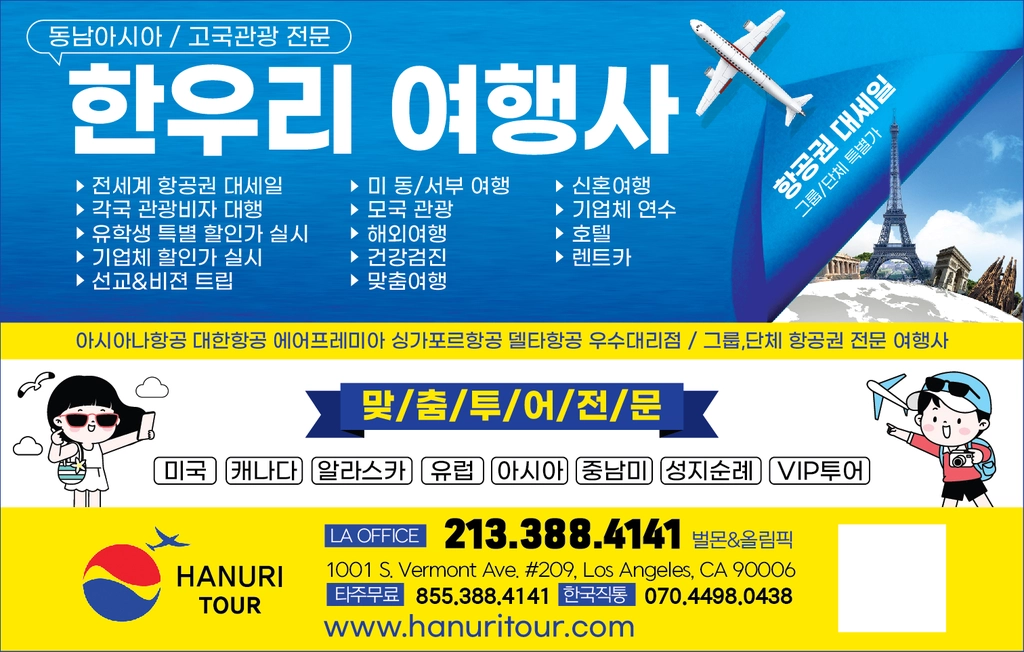 ★ 미국 전지역,북미, 중남미, 유럽, 동남/북아시아, 선교방문,고국 방문,신혼 여행,가족 여행,크르즈 관광,단체 관광, 등등 모든 항공권및 관광 패키지 상품 취급 합니다.
