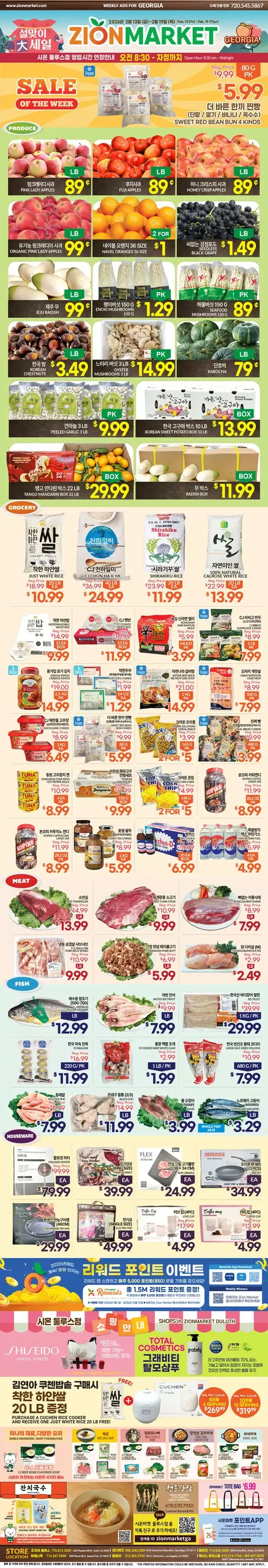 그로서리 코너에서는 착한 하얀쌀 20 LBS 10.99, CJ 천하일미40 LB 24.99, 시라쿠키20 LB 11.99, 자연미인20 LB 13.99, 착한 하얀밥12 EA BOX 9.99, CJ 햇반12 EA BOX 11.99, 농심 신라면 멀티 3.99, 크라운 조리퐁 165 G 2 FOR 5.00,수라상 죽마고우 전병세트550G 9.99,크라운 콘칩 148 G 2 FOR 5.00, 본코피 커피캔디28.2 OZ 8.99, 게 맛살 (오자키) 500 G 7.99, 동원 고추참치캔 4 EA PK 8.99, CJ 비비고 야채 만두 2 LB 7.99, 진짜 빵 시리즈480 G 3.99, 더 바른 한끼 찐빵 5.99에 판매된다.