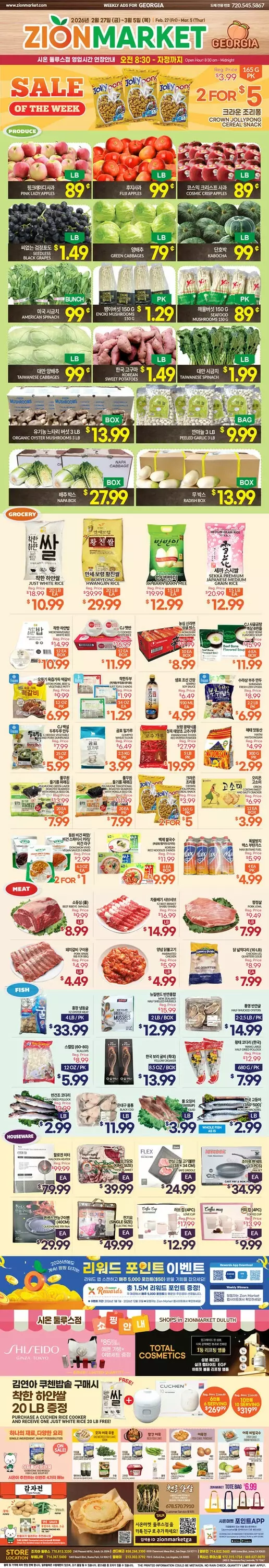 그로서리 코너에서는 착한 하얀쌀 20LB 10.99, 만세 보령 황진쌀20LB 29.99, 세까 스시쌀15LB 12.99, CJ 반반미15LB 12.99,착한 하얀밥12 EA BOX 10.99, CJ 햇반 12 EA BOX11.99, 농심 신라면 싱글 박스10 EA BOX 8.99, 오리온 고소미 12 EA BOX 3.99, 크라운 조리퐁165G 2/5.00, 해태 맛동산300G 2.99,풀무원 들기름 재래김20 EA PK 7.99, 풀무원 들기름 파래김20 EA PK 7.99, CJ 사골곰탕 액상6 EA BOX 11.99, 동원 비건 짜장 6.3OZ 2/1.00, 동원 비건 스파이시 커리6.3OZ 2/1.00, 수라상 부추 만두2.2LB 6.99,백설 두루두루 만두25OZ 5.99에 판매된다.