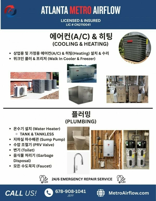상업용 및 가정용 HVAC, 에어컨(A/C), 히팅(Heating), 워크인 쿨러, 워크인 프리저, 설치 및 수리.(LICENSED & INSURED)