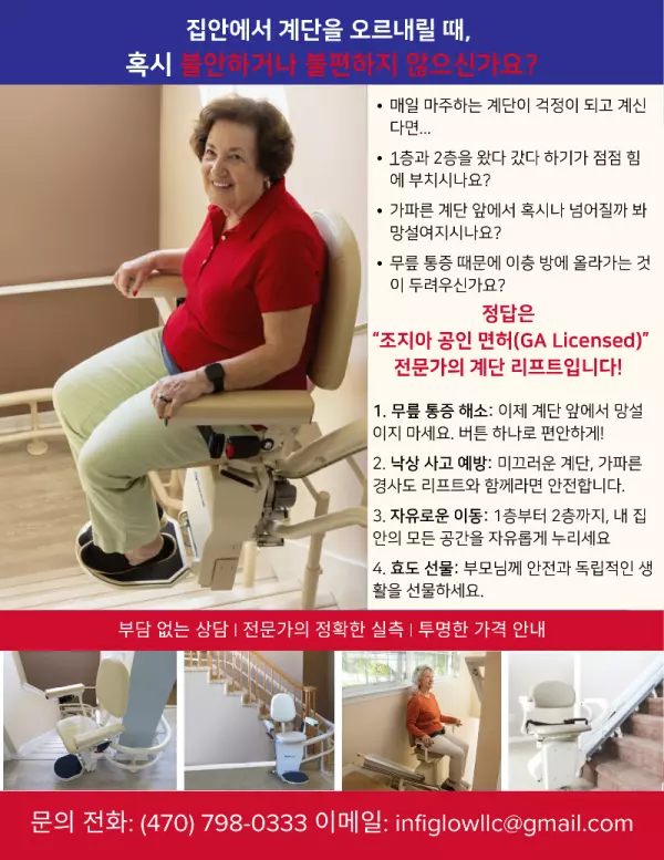 저희는 **조지아 주 정부 공인 리프트 면허(GA Licensed Mechanic)**를 보유한 전문 설치 업체로서, 한인 여러분의 안전한 이동을 위해 정밀하고 튼튼한 계단 리프트(Stairlift) 솔루션을 제공하고 있습니다.