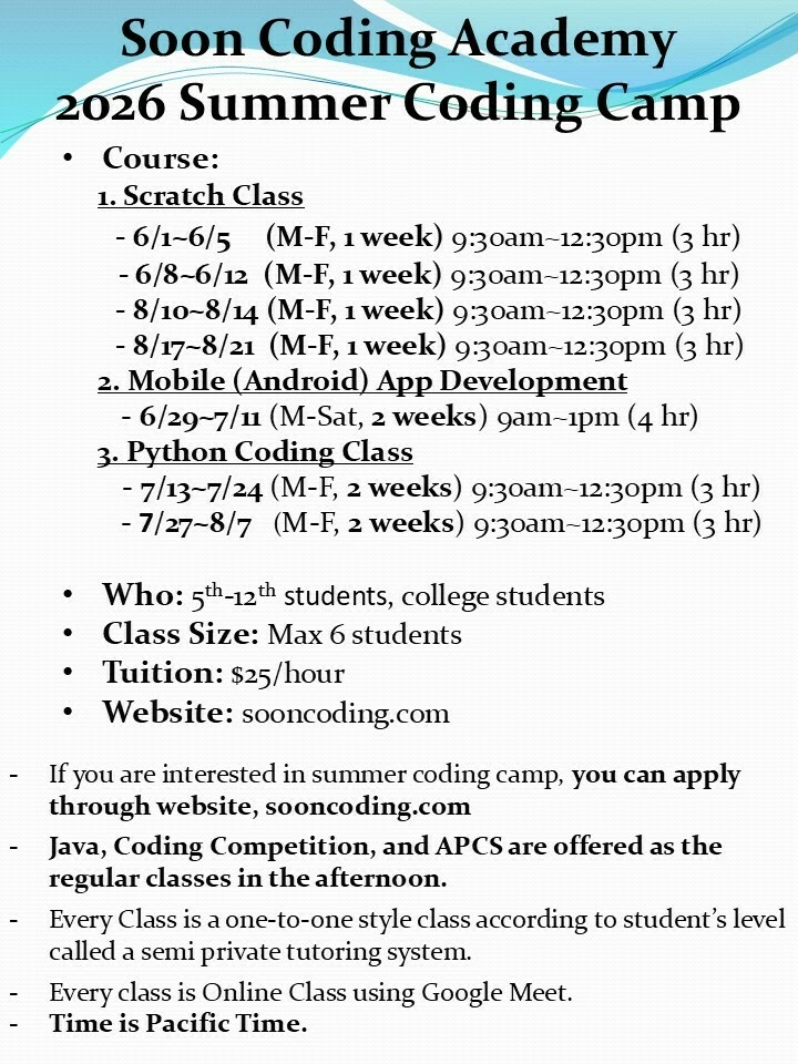 Soon Coding Academy에서 2026년 썸머코딩캠프(Scratch,Python,휴대폰앱) 및 정규코딩(자바,ACSL/USACO,APCSA)를 소개합니다.