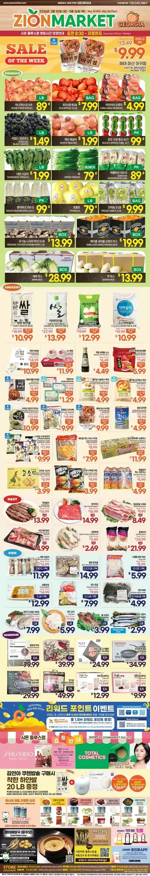 그로서리 코너에서는 착한 하얀쌀 20LBS 10.99, CJ 천하일미20LBS 10.99, 자연미인 쌀20LBS 13.99, CJ 반반미 15LBS 12.99,착한 하얀밥12 EA BOX 10.99, CJ 햇반12 EA BOX 11.99, 오리온 고소미 12 EA BOX 3.99, 에이원 푸드 석쇠 구이포 115G 7.99, 오리온 꼬북칩 라임160G 3.99, 농심 짜파게티 싱글박스10 EA BOX 11.99, 오뚜기 북경반점 짬뽕MULTI 5.99, 해태 해물 육개장500G 4.99, 풀무원 사골육수 떡국12.46OZ 4.99,수라상 모란각 막국수903G10.99, 맑을청 꼬치어묵1KG 9.99, 해태 마산 아귀찜690G 9.99, 동원 꽁치캔 400G 4.99, 백설 남해굴 소스350G 4.49, 수라상 부추잡채/유산슬/잡채 수제 왕만두800G 9.99에 선보인다.