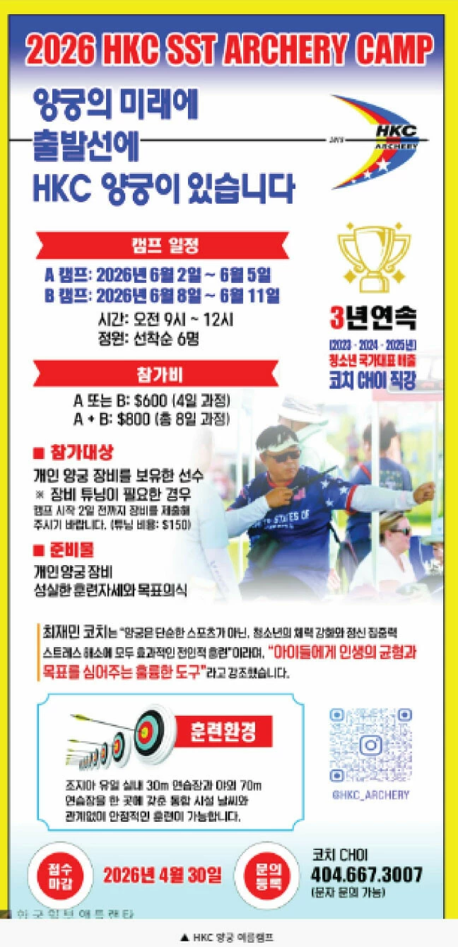 "양궁의 미래, 그 출발선에 HKC 양궁이 함께합니다!" 3년 연속(2023~2025) 청소년 국가대표를 배출한 코치 CHOI의 직강으로 진행되는 프리미엄 양궁 캠프가 열립니다. 체계적인 훈련과 최적의 환경에서 실력을 업그레이드할 기회를 놓치지 마세요!