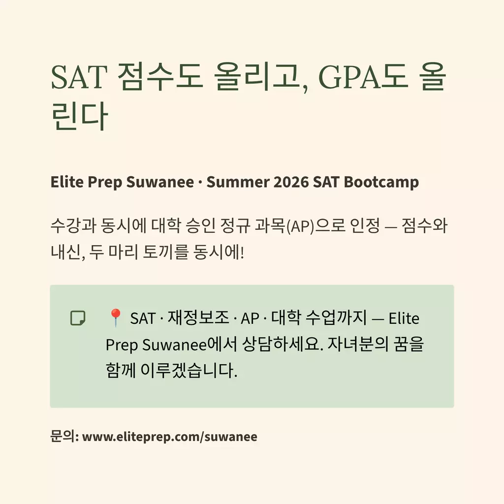 2026년 여름, SAT의 패러다임이 바뀝니다.단순히 점수만 올리는 캠프는 끝났습니다. 엘리트 학원의 SAT Bootcamp는 수강과 동시에 대학 승인 정규 과목(AP급)으로 인정받아, 여러분의 고등학교 GPA를 수직 상승시킵니다.점수와 내신, 두 마리 토끼를 동시에 잡는 유일한 선택! 스와니 엘리트 학원에서 아래와 같이, 학부모님께 유용한 정보를 전해드립니다.