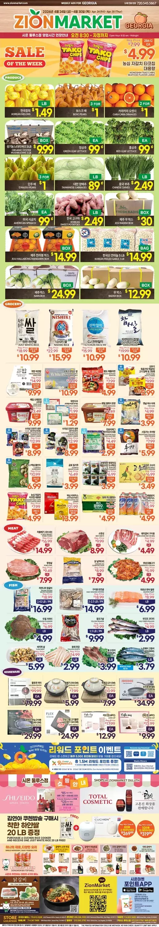 그로서리 코너에서는 착한 하얀쌀 20LBS EA 10.99,니시키 쌀15LBS EA 15.99, CJ 천하일미 20LBS EA 10.99, 자연미인 찹쌀15LBS EA 10.99, 착한 하얀밥12 EA BOX 9.99, 오뚜기 맛있는 밥12 EA BOX 10.99, 팔도 해물라면 MULTI PK 4.99,수라상 모란각 열무 비빔냉면2.38 LB PK 18.99, 오뚜기 육즙가득 떡갈비340G PK 5.99, 오리온 고소미12 EA BOX 3.49,농심 자갈치 타코칩 대용량286G PK 4.99,곰표 밀가루 2.5KG PK 3.99, CJ 백설 물만두28OZ PK 6.99,옛날 여수 어묵400G PK 3.99, 매일 신태양초 고추장 3KG EA 9.99, 시집가는 추어탕500GPK 5.99, 보령대천 청정맛김 재래 12단 도시락김12 EA PK 3.99, 컨츄리에그 케이지프리 MB 20CT PK 2.99, 동화 까스활명수10 EA BOX 4.99,착한두부14OZ EA1.2, 폭발방지 맥스 부탄가스4 EA PK 4.99에 판매된다.