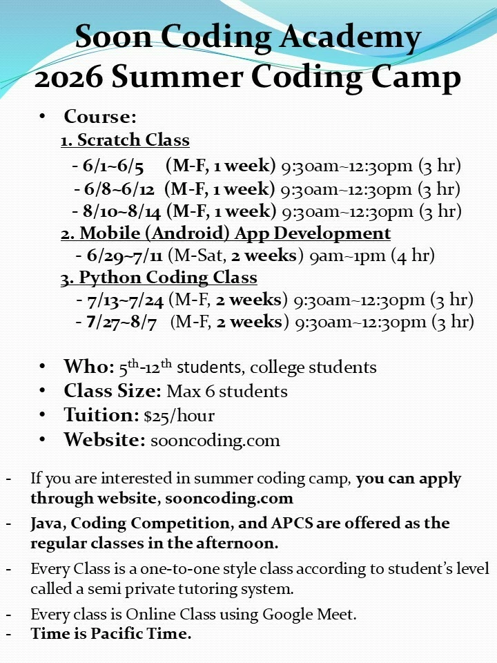Soon Coding Academy에서 2026년 썸머코딩캠프(Scratch,Python,휴대폰앱) 및 정규코딩(자바,ACSL/USACO,APCSA)를 소개합니다.