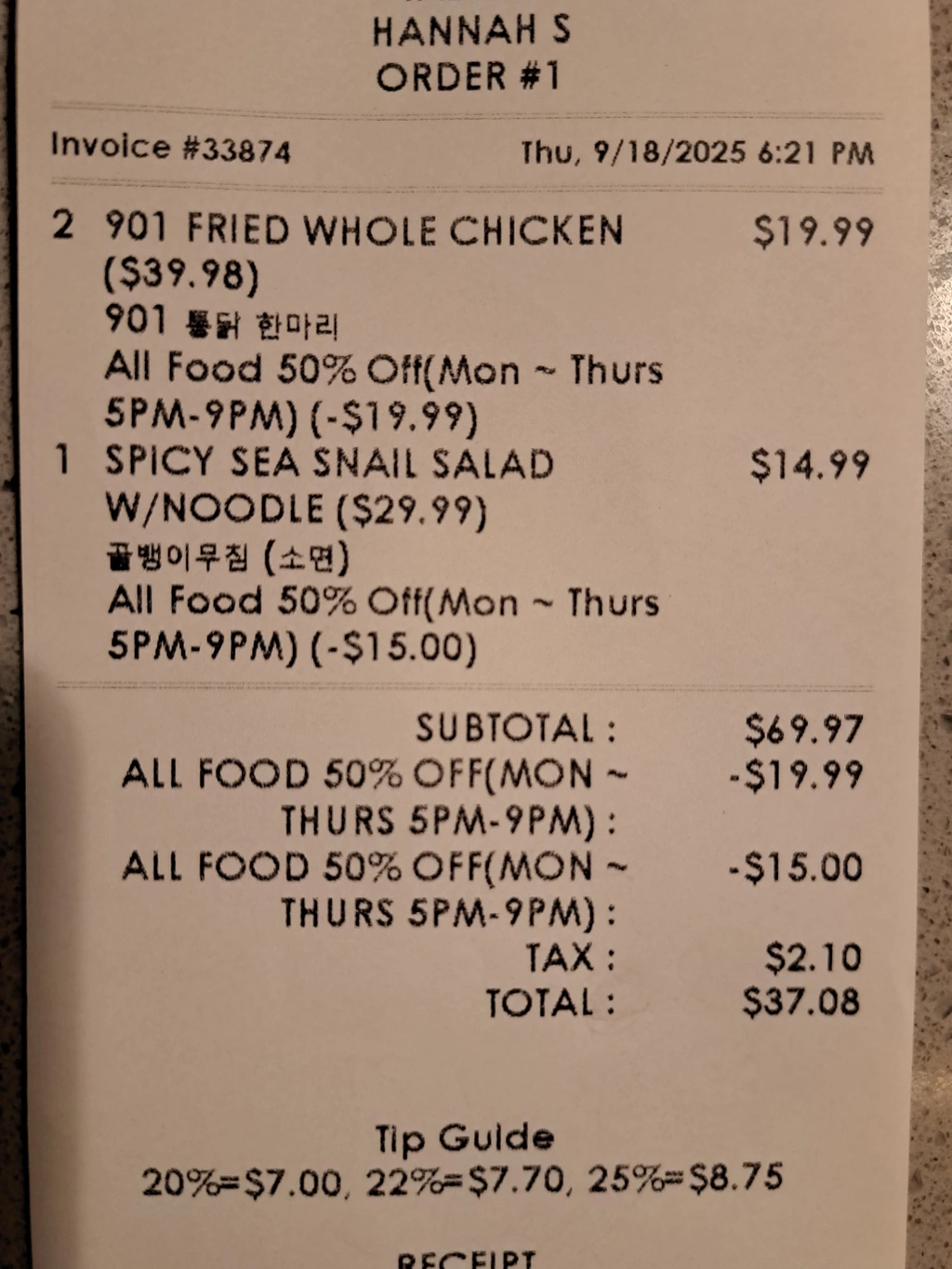 증거 자료로 영수증을 올려봤읍니다. 위에서 말씀을 안드렸는데 껍데기가 느~무 좋아서 닭한마리 추가 했읍니다. ㅎㅎ
