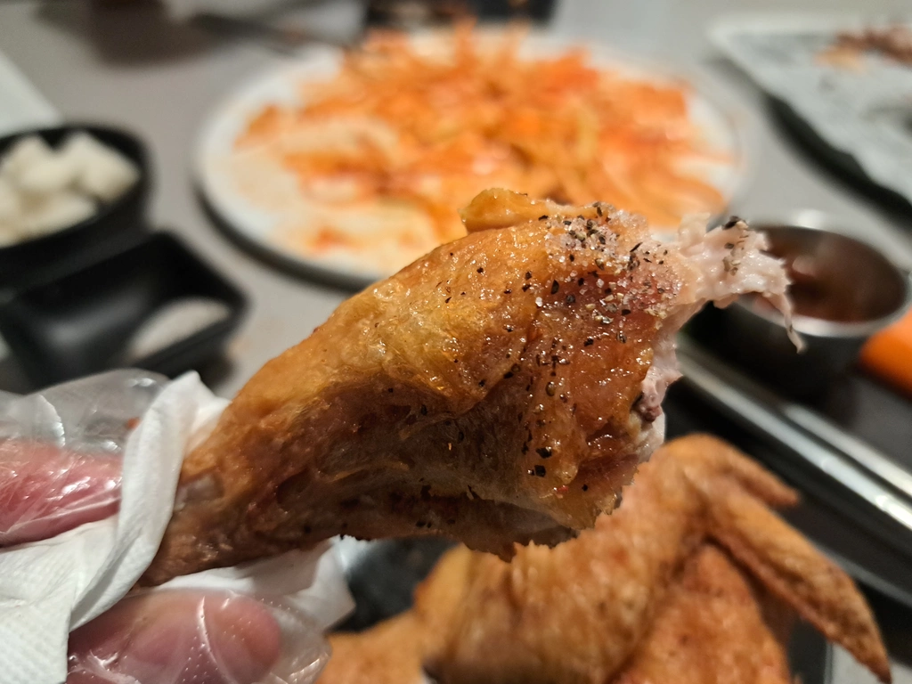 몇호인지는 알수 없지만 영계임에는 틀림이 없는것 같습니다. 그렇다고 삐쩍 마른 살없는 닭도 아닌것이, 다리살이 토실토실 합니다. 닭껍데기가 이렇게 맛이 있다고 느껴본 건 처음입니다.