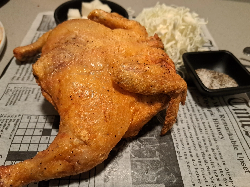 이어지는 순서. 아직도 쎅시함을 자랑하는 몸매의 옛날통닭입니다. 튀김옷 없이 바삭하게 튀겨내서 느끼함이 일도 없이 단백한데 후추가루와 소금을 찍어 씹어주니 고소함이 배가 됩니다