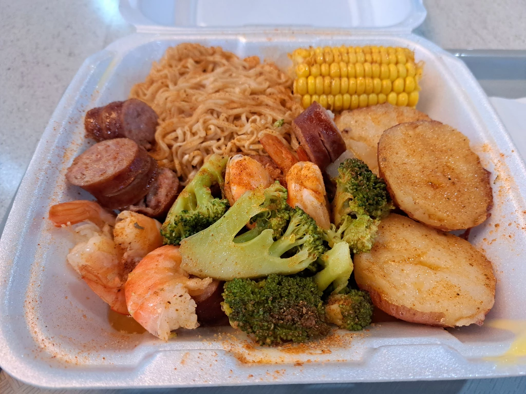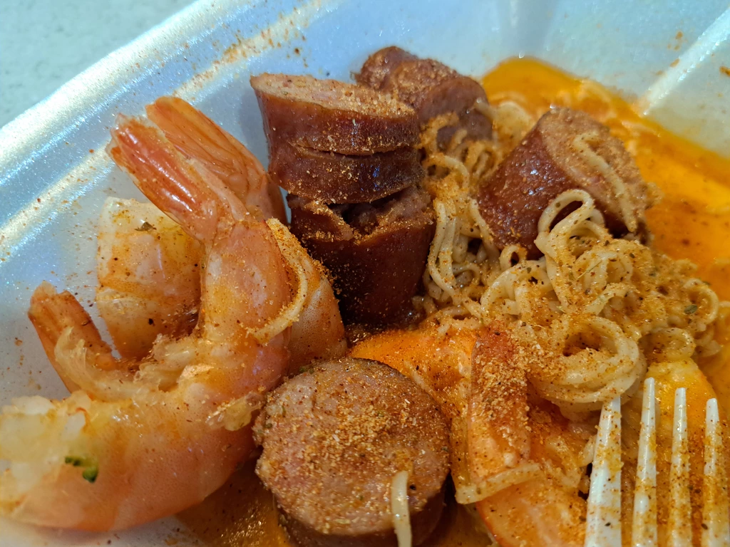 탄수화물이 없으면 더 좋을 것 같아 고심끝에 주문한 Cajun Noodle입니다. 6마리 새우, 6조각 쏘세지, 꽤나 큰 감자, 옥수수, 브로클리, 면가 Cajun Sauce에 조리되어 나왔는데 이거이 정상 가격이 $13.99. 근데 그랜드 오프닝 기념으로 30% Discount까지 해주시니 대충 계산해도 $10미만이라는 기가 막힌 낭보.