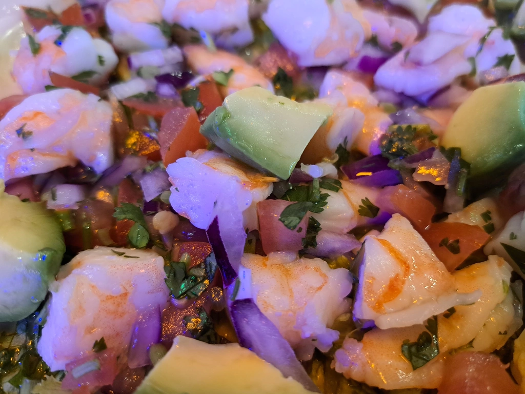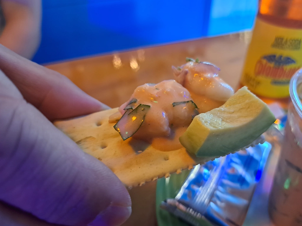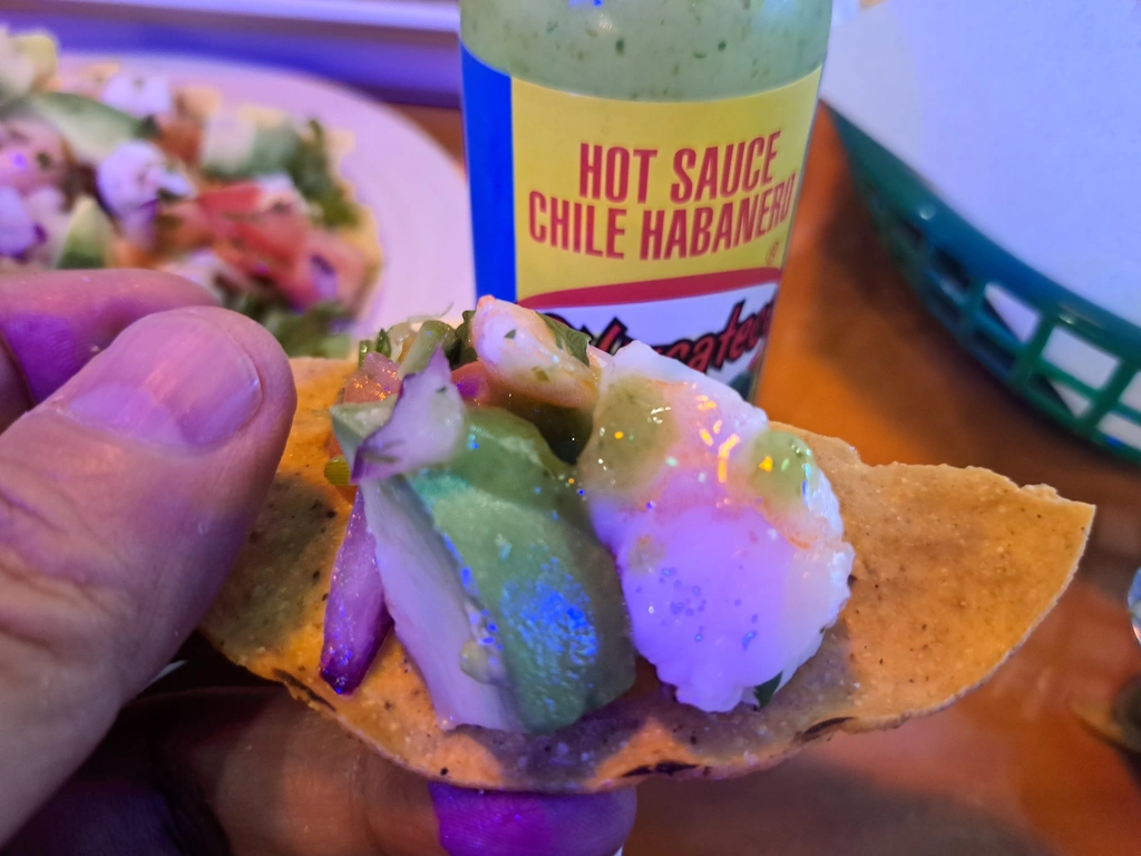 머리위 신호등 색깔의 조명 때문에 블루베리 요구르트를 연상시킬수도 있지만 사실은 분홍색에 가까운 콜롬비아식 cocktail입니다. (Small Las Palmeras). 캔쿤에서의 멕시칸 스타일의 그녀와는 몽타주에서 차이가 좀 나지만 주내용물인 새우, 문어다리, 양파, 할라피뇨와 셀란트로는 한눈에 보입니다.