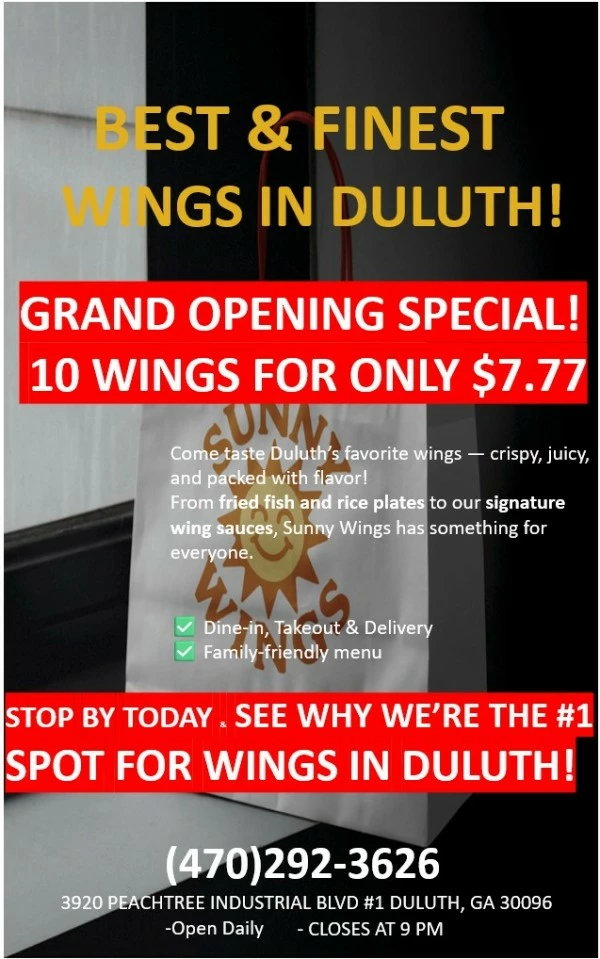 17777 | [ 그랜드 오프닝 ]GRAND OPENING SPECIAL $7.77 10PC WINGS SUNNY WINGS-DULUTH | 32 | SunnyWingsDULUTH | 10/23/2025 |