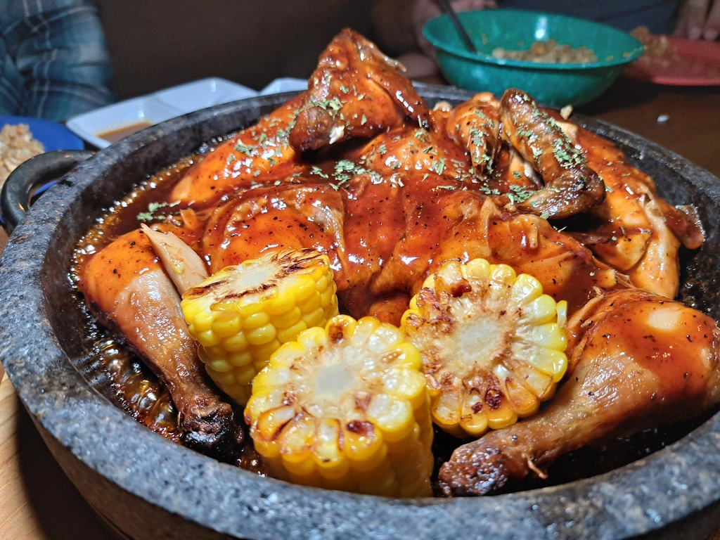서버님의 강추였던 메인디쉬인 고추장 양념 누룽지 치킨입니다. 돌판위에 누룽지를 요를 깔듯이 깔고 옹크림없이 다리마저 요염하게 벌린 전기구이 통닭이 바베큐쏘스 베이스와 고추장의 배합으로 추측되는 쏘스로 온몸을 팩하고 옥수수를 가랭이에 낀채 떡하니 누워 있읍니다.