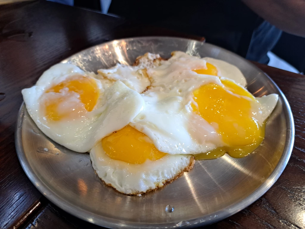 이거슨 보통의 계란 후라이가 아녀. 이거슨 사장님의 쎈스인겨. 계란 후라이에 밥을 비빈후 돼지고기를 감싼 김치찜을 지델루 즐겨보란 사장님의 쎈스.