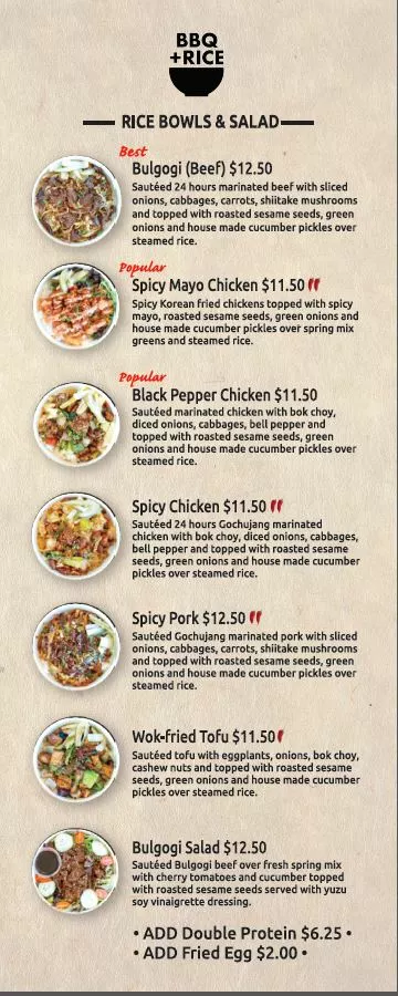 주문하시면 웤으로 바로 요리를 해드립니다. 불고기 덮밥, 제육덮밥, Korean Fried Chicken으로 만든 스파이스 마요치킨 덮밥, 닭갈비 Feel나는 스파이스 치킨 덮밥, 두부덮밥, 블랙페퍼 치킨, 불고기 샐러드, Korean Fried Chicken 등이 여러분을 기다리고 있습니다.
