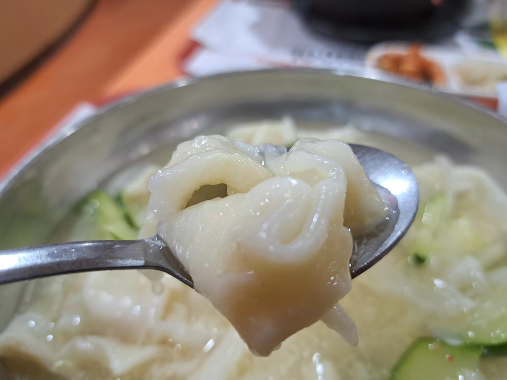시제품인 돌돌이 감자 수제비에 익숙했던 저에게 직접 반죽해 얇게 뽑아낸 수제비의 식감은 생각과는 차이가 있었읍니다. 완탕 껍데기보다 탱클탱글한 식감이 살아있지만 소화하기에도 전혀 부담스럽지 않은 (뭔 소리야? 돌맹이도 씹어 먹을 놈이..) 적당한 식감의 완전 수제 수제비입니다 (그래서 수제비인가? ㅋㅋ).
