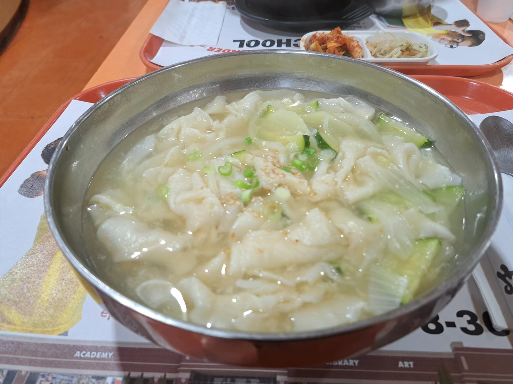 오늘은 수제비를 주문해 봤는데 흠.....첫인상은 너무 오래 끓여서 알맹이 다빠진 완탕스프를 연상시키는, 좀 거시기한 비쥬얼.