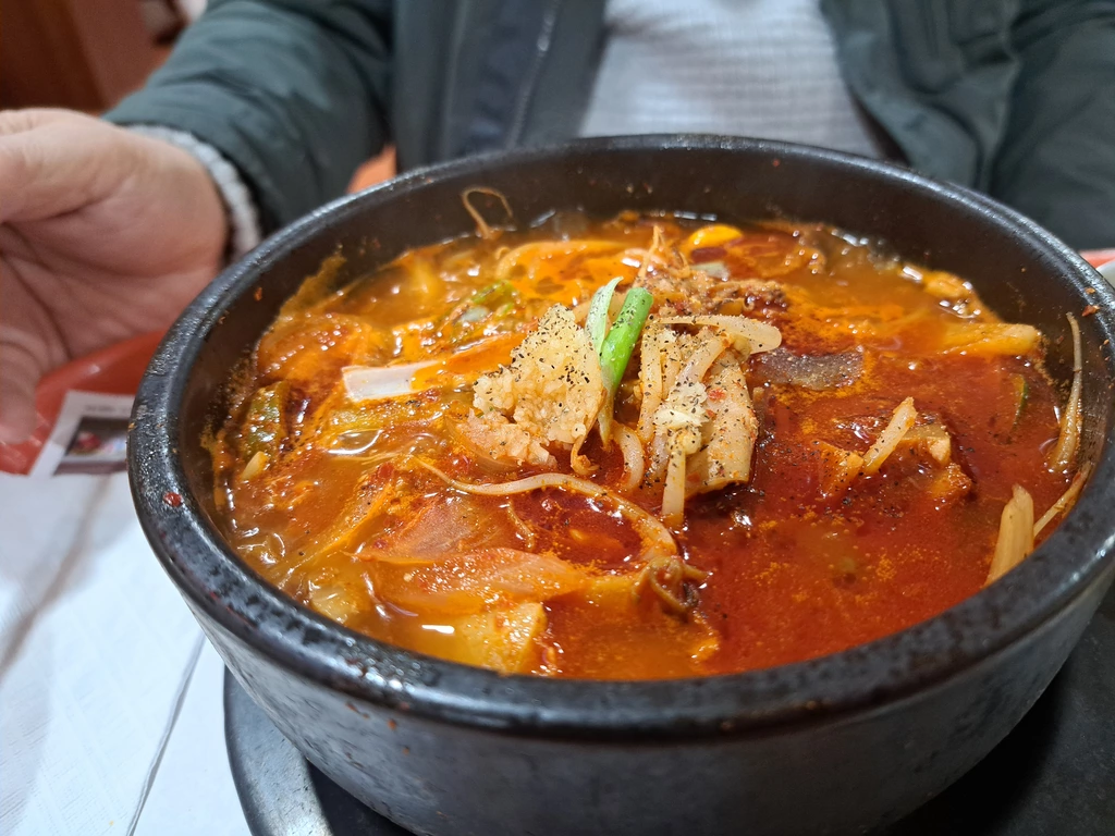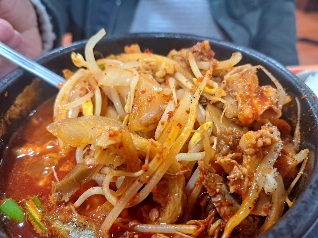 콩나물, 곱창을 비롯한 내장들이 보기만해도 어금니들이 씹어 보고 싶어서 안달이 나는 비쥬얼. 칭구 녀석의 얼굴은 얼큰한 맛에 벌써 경기 도중 자유투를 던지는 샤킬오닐의 얼굴처럼 땀으로 범벅.