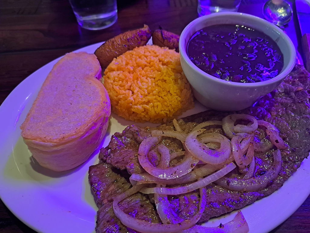 스테이크의 두께는 Gyro meat의 두께와 삐까삐까. 멕시코에서 자주 보는 Skirt Steak인지 아니면 쿠바의 공산주의화의 영향인지 육즙을 가둘곳이 없을만큼 얇습니다. 그래도 고기인지라 거부를 할수 없었고 새끼 빠나나 튀긴것과 함께 좀 씹다보니 까만 칠리를 제외한 모든 것이 사라지는 마술을 경험하게 되었읍니다.