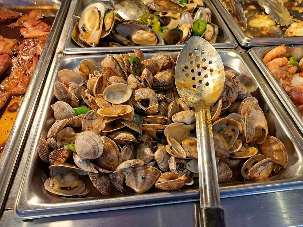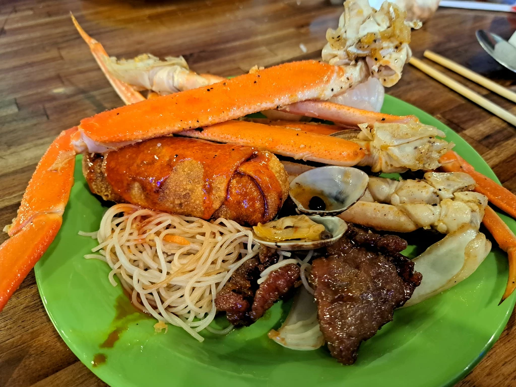몽골리안 비프, 싱가폴 누들, 조개볶음, 에그롤에 게다리 몇개 언져 4번째 접시를 준비해 왔지요.