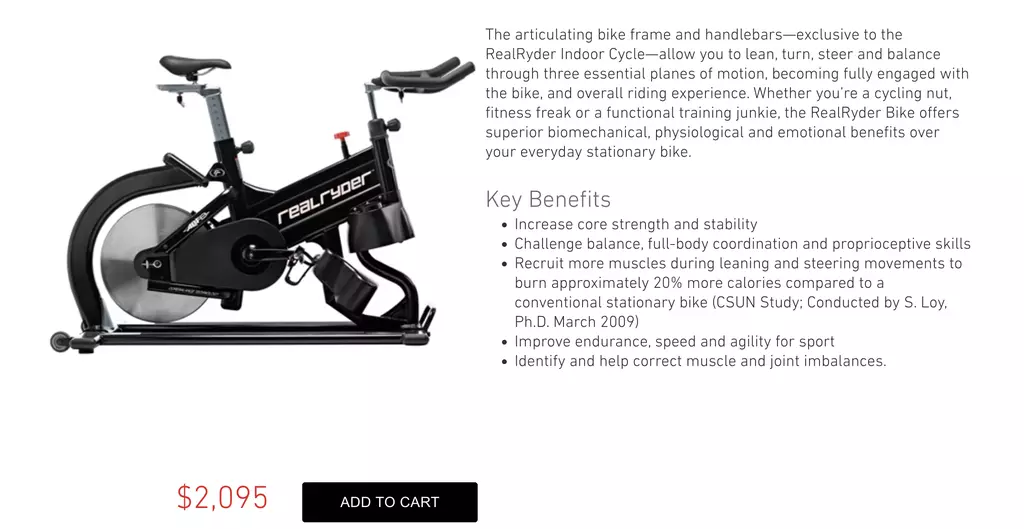 RealRyder ABF8는 기구 프레임이 움직여서 기울이고, 핸들 조정하며 균형 잡는 것이 가능한 프로용 인도어 사이클입니다 - 일반 고정 실내 자전거보다 훨씬 리얼한 라이딩 경험을 제공합니다. 견고한 강철 프레임, 30kg 플라이휠, 최대 사용자 체중 약 136kg까지 지원. 안장과 핸들 조절 자유롭고 SPD 페달, 물병 케이지 2개 등이 포함. 고강도 유산소 운동, 코 어 강화, 균형 감각 향상에 탁월한 제품입니다.