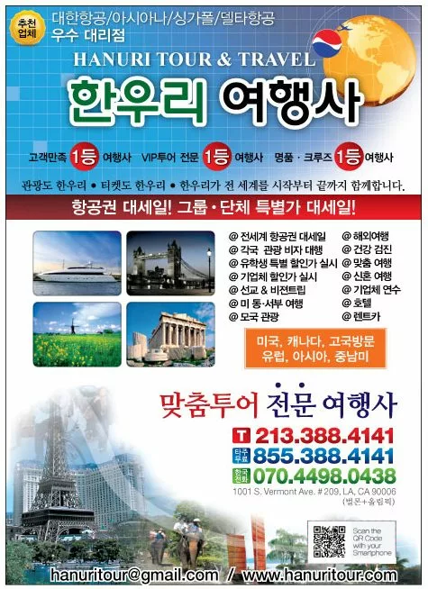 ★ 미국 전지역,북미, 중남미, 유럽, 동남/북아시아, 선교방문,고국 방문,신혼 여행,가족 여행,크르즈 관광,단체 관광, 등등 모든 항공권및 관광 패키지 상품 취급 합니다.